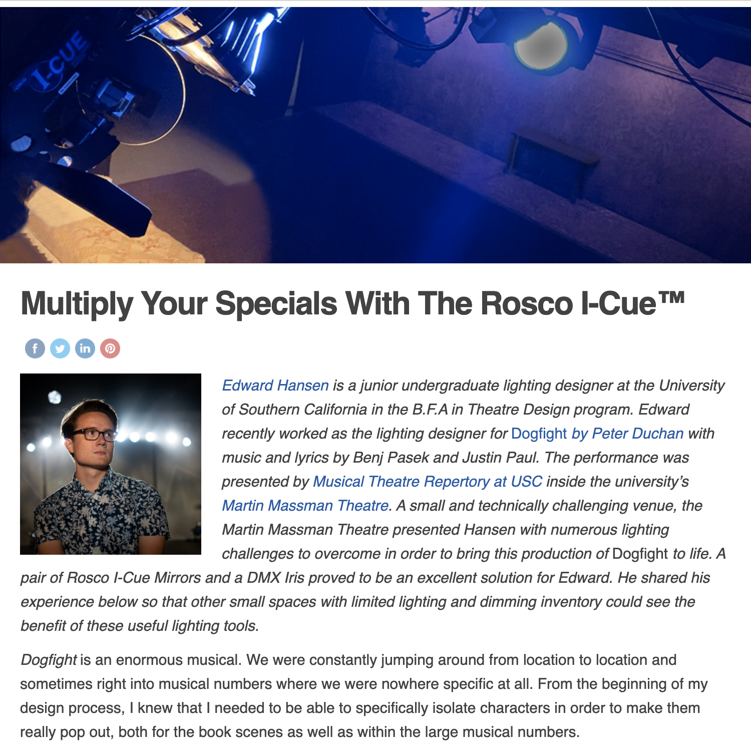 Edward's production of Dogfight was featured on the Rosco Spectrum Blog for its use of Rosco's I-Cue™ Intelligent Mirror and DMX Iris™. Click here to read the post.
